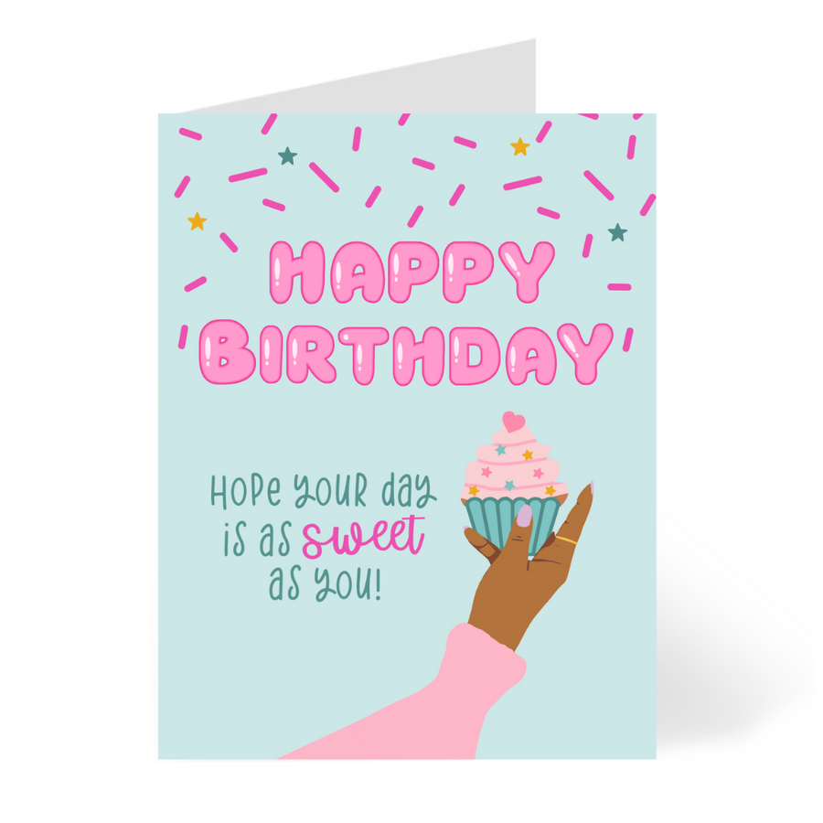 Celebrate birthdays in style with this sweet and sassy As Sweet As You birthday card! Featuring a brown hand and a cupcake with sprinkles, this card is as chic as it is sugary. No need to search for the perfect words – the hand lettering says it all! 🤩