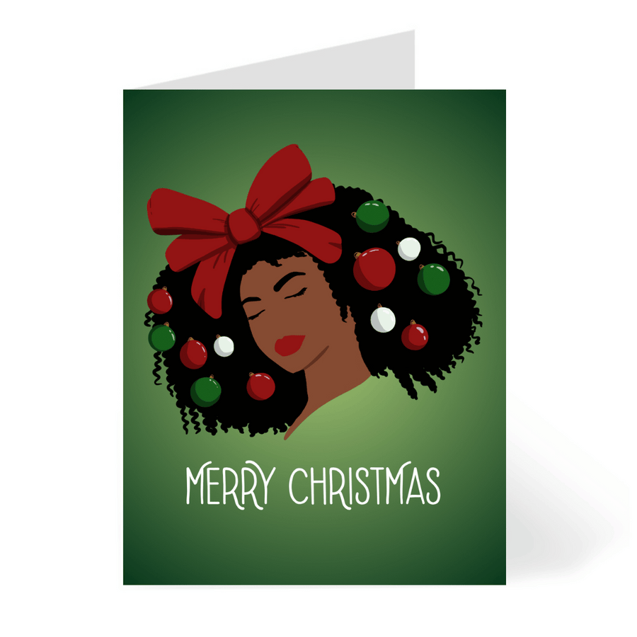 Celebrate the season in style with our "Holiday Hair 1" card, featuring a beautiful woman with natural curls decorated in festive ornaments and topped with a bold red bow. This chic and culturally inspired design captures the joy of the holidays while embracing individuality and pride in heritage. The "Merry Christmas" message completes this unique and heartfelt card.